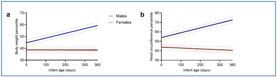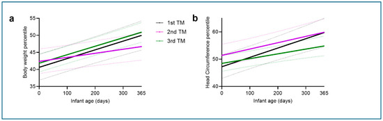 Background: The effect of intrauterine exposure to SARS-CoV-2 infection during pregnancy on neurodevelopment and growth trajectories during the first year of life remains under investigation. Methods: We retrospectively reviewed the electronic medical records of all pregnant women who received care at Mayo Health System and tested positive for SARS-CoV-2 (RT-PCR) from March 2020 through October 2021 and examined the effects of fetal sex and trimester of maternal SARS-CoV-2 infection on the risk of neurodevelopmental disorder diagnosis and growth trajectories of head circumference (HC) and body weight (BW) percentiles over the first year of life using linear mixed models. Results: We observed that a higher percentage of male infants (n = 357), compared to females (n = 344), have neurodevelopmental disorders (10.9% vs. 5.2%, p = 0.008), and infants exposed to maternal SARS-CoV-2 infection in the second (n = 183) or third trimester (n = 358) have a higher prevalence of neurological diagnoses compared to those exposed in the first trimester (n = 160) (1st vs. 2nd vs. 3rd trimester: 0% vs. 0.9% vs. 0.7%, respectively, p = 0.037). In addition, female infants, compared to males, had significantly lower BW (B = −0.04, p < 0.0001) and HC (B = −0.06, p < 0.0001) percentile growth trajectories over the first year of life. Moreover, infants exposed to maternal SARS-CoV-2 infection in the second trimester had a significantly lower BW percentile growth trajectory (B = −0.01, p = 0.006), while infants exposed to maternal SARS-CoV-2 infection in the third trimester had a significantly lower HC percentile growth trajectory (B = −0.02, p = 0.02). Conclusions: In utero exposure to maternal SARS-CoV-2 infection could have long-term effects on growth trajectories, depending on the infant’s sex and timing of exposure.