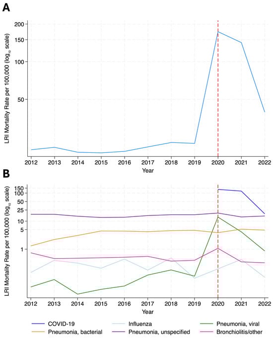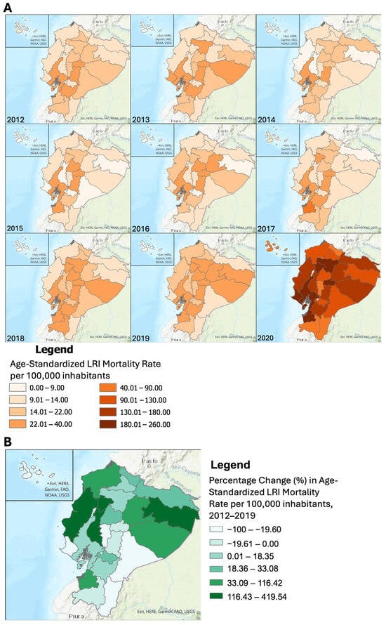 Lower respiratory infections (LRIs) are responsible for significant morbidity and mortality in Ecuador; however, evidence to support prevention strategies is limited. This study aimed to identify age-specific trends, spatial patterns, and sociodemographic risk factors of LRI mortality in Ecuador between 2012–2022, utilizing national