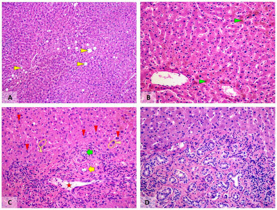 The COVID-19 pandemic caused more than seven million deaths, mostly via acute respiratory distress syndrome with microvascular thrombosis. Compared to the amount of information about pulmonary pathology, information about COVID-19-induced liver lesions is scarce, especially with regard to the long-term consequences. The aim of our study was to evaluate inflammatory, vascular and fibrotic changes in hepatobiliary tissues of patients with a history of COVID-19 (post-COVID-19 patients). Based on the Knodell score, moderate portal inflammation was observed in 41.2% of post-COVID-19 patients, contrasting with 14.3% of control cases (p = 0.06). Moderate periportal inflammation was present in 26.5% and 7.1% of patients, respectively (p = 0.08). Post-COVID-19 patients showed higher counts of CD3+ lymphocytes (p = 0.02) and lower counts of CD68+ macrophages (p = 0.04), as well as more frequent and extensive regenerative changes in hepatocytes and the biliary epithelium (p = 0.0007). We did not find significant fibrosis or pathological changes in blood vessels, and only mild steatosis was observed in both groups.