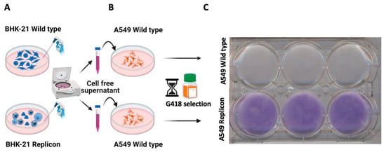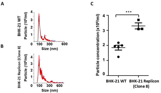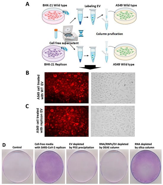 The concentration of extracellular vesicles (EVs) in the peripheral blood of COVID-19 patients is increased. Nevertheless, their potential role in the transmission of infection remains unclear. This study was performed to determine whether EVs produced by the sub-genomic replicon system developed in Baby