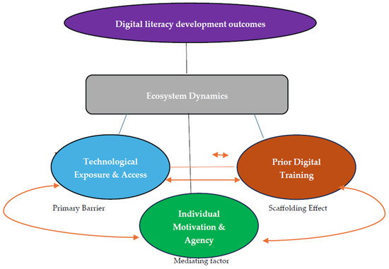 This study investigates digital literacy thresholds within South African higher education institutions in the context of Industry 4.0, focusing on entrepreneurship education. The research addresses the critical gap between current digital competencies and Industry 4.0 requirements, challenging assumptions about “digital natives” and examining factors influencing digital literacy development. A qualitative methodology employing semi-structured interviews was conducted with 25 participants, including 11 faculty members and 14 entrepreneurship students from a South African higher education institution. Data underwent rigorous thematic analysis following Braun and Clarke’s six-phase approach. The study revealed significant disparities in digital competencies among both faculty and students, contradicting binary digital native classifications. Key findings identified distinct transformative thresholds separating performative digital interaction from entrepreneurial digital practice, with access, training, and motivation forming interconnected factors in a digital literacy ecosystem. Most participants demonstrated bounded digital fluency limited to familiar environments rather than transferable entrepreneurial capabilities. The research introduces novel theoretical contributions, including “entrepreneurial digital thresholds” and “digital literacy structuration,” advocating for contextually responsive frameworks addressing socioeconomic inequalities. Practical implications include targeted professional development, multidimensional assessments, and policies prioritising equitable digital participation to prepare graduates for meaningful engagement in the global digital economy rather than passive consumption.