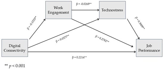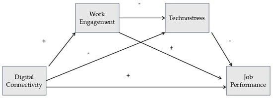 Background: The COVID-19 pandemic has accelerated the adoption of smart working and digital connectivity, transforming workplace interactions. While this shift offers flexibility and autonomy, it also raises concerns about workload management, psychological health, and work–life balance. Method: This study utilized a sample of 1185 employees from a multinational company operating in Italy to examine the impact of digital connectivity on work engagement, technostress, and job performance, framed within the Job Demands-Resources (JD-R) model. Participants completed surveys measuring digital connectivity, work engagement, technostress, and job performance. Results: The findings revealed moderate levels of digital connectivity and technostress, alongside high levels of work engagement and job performance. Mediation analysis indicated that work engagement positively mediated the relationship between digital connectivity and job performance, while technostress negatively impacted job performance. Notably, the two mediators operated independently rather than sequentially. Value: this research highlights the dual nature of digital connectivity as both a resource and a demand in the workplace. It underscores the importance of implementing strategies to enhance work engagement while addressing technostress. Organizations can benefit from adopting “right to disconnect” policies and flexible work arrangements to foster a healthier work environment, ultimately improving employee well-being and productivity in the digital age.