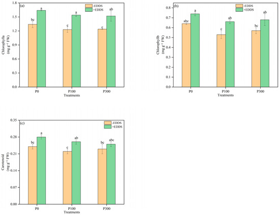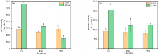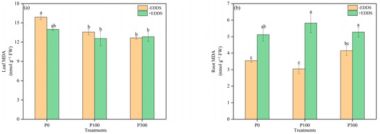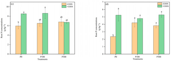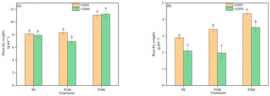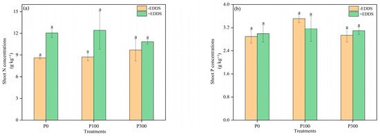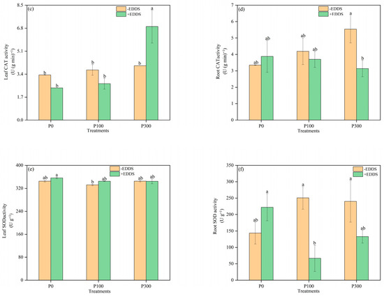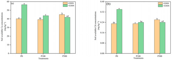 The use of biodegradable chelating agents and fertilizer to improve phytoremediation is a cost-effective and environmental-friendly method for remediation of copper (Cu)- and cadmium (Cd)-polluted agricultural soil. A pot experiment was conducted to investigate the effects of phosphorus (P) fertilizer and the chelator ethylenediamine disuccinic acid (EDDS), both individually and in combination, on the phytoremediation efficiency of castor plants. The experiment included six treatments with three replicates, which were as follows: control (no P or EDDS), EDDS alone, P at 100 mg kg−1, P at 300 mg kg−1, P at 100 mg kg−1 + EDDS, and P at 300 mg kg−1 + EDDS. The results demonstrated that phosphorus significantly promoted the growth of castor plants. In the treatment in which 300 mg kg−1 P2O5 and 5.0 mmol kg−1 EDDS were added, the shoot dry weight and root dry weight increased by 42.0% and 67.6%, respectively, when compared to the treatment only applying EDDS, and this treatment significantly promoted the absorption of Cd by shoots of castor. In the absence of phosphorus application, EDDS significantly diminished the dry weight of castor roots by 27.3%. Nevertheless, it improved the concentrations of Cu in the shoots and roots of castor plants, which were 3.43 times and 3.27 times higher than those of the control, respectively. Furthermore, when combined with phosphorus fertilizers, EDDS further promoted the absorption of Cu and Cd in the shoots of castor, which significantly increased by 13.34 times and 0.47 times, respectively, with addition of 100 mg kg−1 phosphorus and 5.0 mmol kg−1 of EDDS compared with the control. Phosphorus and EDDS synergistically decreased the activity of POD enzymes in leaves and roots compared with those treated with only EDDS and alleviated the toxicity of EDDS and heavy metals to castor plants. These findings provide scientific evidence for the use of agronomic measures and chelators to optimize phytoremediation efficiency in Cu and Cd co-contaminated soils.