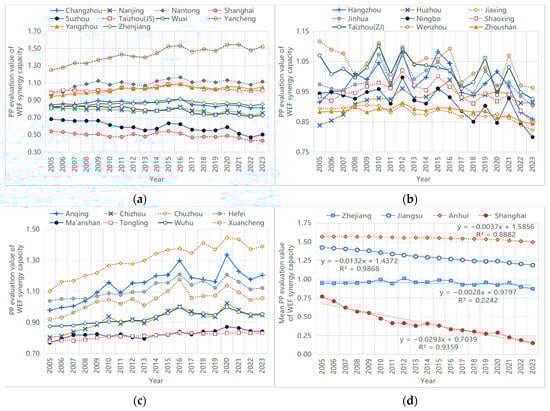 Water, energy, and food (WEF) constitute the core strategic resources essential for regional sustainable development, and the governance of the WEF system holds critical significance for the Central Area of the Yangtze River Delta (caYRD)—one of China’s most economically dynamic regions. In this area, however, the potential risks associated with insufficient WEF synergy capacity have become increasingly prominent amid continuous population growth and rapid urbanization. Against this backdrop, this study aimed to evaluate the WEF synergy capacity of 27 prefecture-level cities (PLCs) in the caYRD over the period 2005–2023 using the Projection Pursuit Model (PPM), based on an evaluation framework encompassing 12 indicators. Our results revealed that (1) the WEF system exhibits significant spatiotemporal heterogeneity, which is evident not only in the water resource, energy resource, and food resource subsystems but also in the overall WEF synergy capacity. In the water subsystem, Wenzhou and Ma’anshan achieved the highest and lowest PPM evaluation scores, respectively; in the energy subsystem, Zhoushan and Shanghai recorded the highest and lowest scores, respectively; and in the food subsystem, Yancheng and Zhoushan ranked first and last in terms of PPM scores, respectively. (2) For the integrated WEF synergy capacity evaluation, Yancheng obtained the highest score, whereas Shanghai ranked the lowest; additionally, Chuzhou exhibited the largest fluctuation range in scores, while Taizhou (Jiangsu) exhibited the smallest fluctuation range. (3) Subsequently, based on the PPM evaluation values of WEF synergy capacity, the 27 PLCs were clustered into three groups: the High WEF synergy capacity value cluster, which includes Yancheng and Chuzhou; the Low WEF synergy capacity value cluster, which consists of Shanghai and Suzhou; and the Mid-level WEF synergy capacity value cluster, which comprises the remaining 22 PLCs and is further subdivided into three sub-clusters. The cluster results of WEF synergy capacity imply that special attention to the consumption control of WEF resources is required for different PLCs. The variations in WEF synergy capacity and its spatial distribution patterns provide critical insights for formulating region-specific strategies to optimize the WEF system, which is of great significance for supporting sustainable development decision-making in the caYRD.
