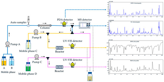 In this study, an integrated analytical method coupling ultra-high-performance liquid chromatography–photodiode array detection–quadrupole time-of-flight mass spectrometry with total antioxidant capacity determination (UHPLC-PDA-Q-TOF/MS-TACD) was developed for the rapid screening and identification of antioxidants in complex natural extracts. The system enables simultaneous chromatographic separation, mass