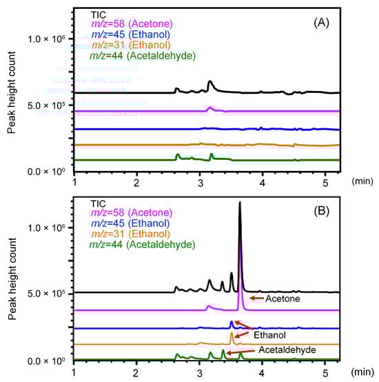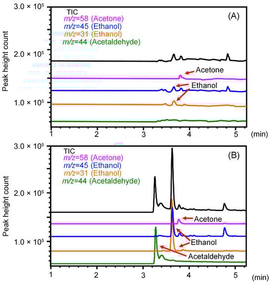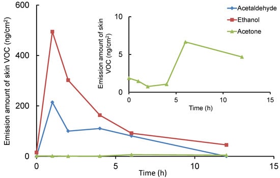 Volatile organic compounds (VOCs) emitted from human skin are promising biomarkers for non-invasive health assessment and disease diagnosis. However, efficient collection and sensitive analytical methods for skin VOCs remain challenging. We developed a method for measuring ethanol, acetaldehyde, and acetone from palmar skin