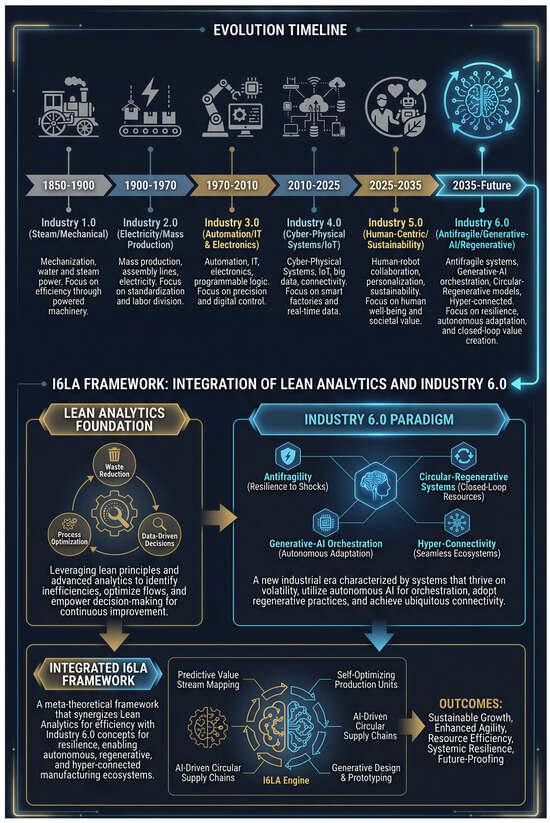 The convergence of Lean manufacturing principles with Industry 4.0 has yielded significant operational improvements, yet the emerging paradigm of Industry 6.0—characterized by antifragile, autonomous, and sustainable systems—demands a fundamental rethinking of existing analytical frameworks. This paper introduces the Industry 6.0 Lean Analytics (I6LA) Framework, a novel meta-theoretical approach that integrates Lean principles with the core concepts of Industry 6.0. By systematically analyzing the limitations of current Lean analytics in the context of Industry 6.0 requirements, we identify critical gaps in areas such as system resilience, AI-driven autonomy, and circular economy integration. The I6LA Framework addresses these gaps through four new theoretical pillars: Antifragile Lean Systems Theory, generative AI-Orchestrated Value Streams, Circular–Regenerative Analytics, and Hyper-Connected Ecosystem Integration. This research provides a new set of mathematical models for measuring antifragility, generative orchestration efficiency, and circularity, offering a comprehensive analytical toolkit for the next generation of manufacturing. The framework’s primary contribution is a paradigm shift from optimizing stable, human-in-the-loop systems to managing dynamic, autonomous ecosystems that thrive on volatility and are regenerative by design. This paper provides both a robust theoretical foundation and practical implementation guidance for organizations navigating the transition to Industry 6.0.
