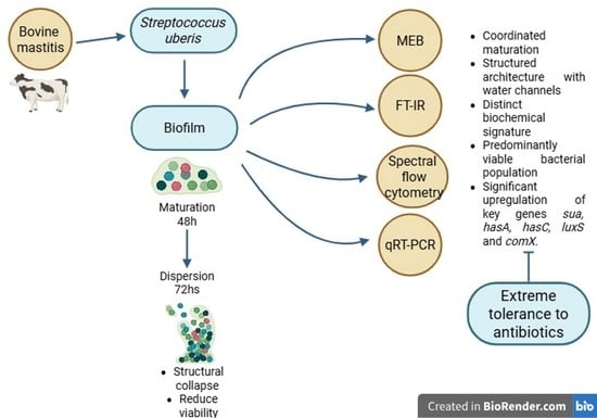 Streptococcus uberis is a bovine mastitis pathogen with a demonstrated ability to form biofilms. However, the dynamics of this process remain poorly characterized. This study aimed to comprehensively characterize biofilm formation in four S. uberis strains that differed in their biofilm-forming capacity, from weak to strong producers, and in the presence of key virulence-associated genes, such as sua, hasA and hasC. To achieve this, we integrated structural, biochemical, physiological and transcriptional analyses using scanning electron microscopy (SEM), Fourier-transform infrared spectroscopy (FT-IR), spectral flow cytometry and qRT-PCR. The multi-faceted analysis revealed a coordinated maturation peak at 48 h, characterized by a structured architecture with water channels, a distinct biochemical signature rich in polysaccharides and proteins, and a predominantly viable bacterial population. This peak coincided with a marked upregulation of key virulence-associated genes, with sua expression increasing 2.5-fold and hasA increasing 3-fold at 48 h. This mature biofilm conferred high tolerance to antibiotics, with eradication concentrations (>256 µg/mL) exceeding planktonic MICs, although tetracycline was notably effective. At 72 h, the biofilm entered a dispersion phase characterized by structural collapse and reduced viability. These findings establish S. uberis biofilm maturation as a highly coordinated process, providing new insights into the biofilm lifecycle of this important pathogen and identifying key temporal and molecular targets for future interventions.