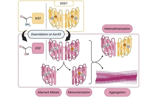 Background/Objectives: Approximately 20% of familial ALS (fALS) cases are linked to mutations in Cu/Zn superoxide dismutase (SOD1). Through a gain function, SOD1 misfolding exerts a toxic effect on motor neurons, leading to their degradation and ALS symptomology in both fALS cases and sporadic ALS (sALS) cases with no known genetic cause. To further our understanding of SOD1-ALS etiology, identifying motor neuron-specific SOD1 post-translational modifications (PTMs) and studying their structural influence is necessary. To this end, we have conducted a study on the influence of the deamidation of Asn53, a PTM proximal to key stabilizing motifs in SOD1, which has scarcely been addressed in the literature to date. Methods: Deamidation to N53 was identified by tandem mass spectrometry of SOD1 immunoprecipitated from motor neuron (MN) cultures derived from wild-type (WT) human induced pluripotent stem cells (iPSCs). WT SOD1 and N53D SOD1, a mutant mimicking the deamidation, were expressed in Escherichia coli and purified for in vitro analyses. Differences between species were measured by experiments probing metal cofactors, relative monomer populations, and aggregation propensity. Furthermore, molecular dynamics experiments were conducted to model and determine the influence of the PTM on SOD1 structure. Results: In contrast to WT, N53D SOD1 showed non-native incorporation of metal cofactors, coordinating more Zn2+ cofactors than total Zn-binding sites, and more readily adopted monomeric forms, unfolded, and aggregated with heating, possibly while releasing coordinated metals. Conclusions: Deamidation to N53 in SOD1 encourages the adoption of non-native conformers, and its detection in WT MN cultures suggests relevance to sALS pathophysiology.