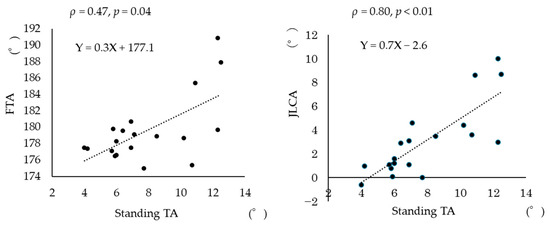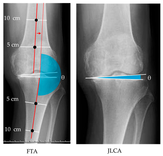 Background: The relationship between varus thrust (VT) during gait and static limb alignment on radiography in knee osteoarthritis (OA) remains unclear. Therefore, the present study investigated the association between the tibial inclination angle (TA), which was noninvasively measured from the body surface, and radiographic parameters. In Addition, this study analyzed how TA changes under different loading conditions (ΔTA) relate to VT acceleration (VTA) during early stance using an inertial measurement unit (IMU) sensor. Methods: Nineteen female patients (mean age: 63.5 ± 8.6 years) with knee OA or medial meniscus injury were included. The TA was defined as the angle between the tibial mechanical axis and a vertical line from the floor, which was measured in standardized standing and supine positions. The ΔTA was calculated as the difference between these positions. To assess lower limb alignment, the femorotibial angle (FTA) and joint line convergence angle (JLCA) were measured. The VTA was measured using IMU sensors on the thigh and tibia, and the differences between lateral and medial VTA were defined as femoral and tibial ΔVTA, respectively. Spearman’s correlation coefficient and linear regression were used for analysis. Results: The standing TA was significantly correlated with the FTA (ρ = 0.47, p = 0.04) and JLCA (ρ = 0.80, p < 0.01). The ΔTA was significantly associated with femoral ΔVTA (β = 0.70, p < 0.01) and tibial ΔVTA (β = 0.67, p < 0.01). Conclusions: Surface-measured TA reflects radiographic alignment. The ΔTA also captures dynamic instability not explained by static measures, suggesting its potential utility as an assessment indicator, although further validation is warranted.