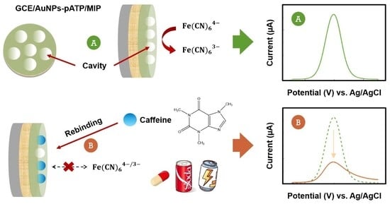 Caffeine is a natural alkaloid consumed primarily for its stimulant and metabolic effects. Some everyday products, such as coffee, tea, soft drinks, sports supplements, and even pain relievers, contain caffeine. However, excessive caffeine consumption, greater than 400 mg per day, can cause adverse effects. Therefore, this work presents an electrochemical sensor based on a molecularly imprinted polymer (MIP) electropolymerized on gold nanoparticles functionalized with p-aminothiophenol (AuNPs-pATP) for caffeine quantification. AuNPs-pATP synthesized show a spherical morphology with an average diameter of 2.54 nm. Stages of MIP formation were monitored by cyclic voltammetry (CV) and electrochemical impedance spectroscopy (EIS) using a potassium ferrocyanide redox probe, where the following were observed: (i) an increase in conductivity upon modification of the GCE with AuNPs-pATP, (ii) the blocking of active sites during the electropolymerization step, and (iii) the release of specific cavities upon template removal, revealing consistent differences between the MIP and the control polymer (NIP). SEM images revealed three-dimensional spherical cavities on MIP surface, while the NIP showed a more compact rough surface. Caffeine quantification was performed using square wave voltammetry (SWV) with LOD of 0.195 µmol L−1 and LOQ of 0.592 µmol L−1. Interference studies indicated high selectivity and a high density of caffeine-specific binding sites in the MIP. Additionally, MIP sensor demonstrated reusability, good reproducibility, and stability, as well as promising results for analysis in soft drink and sports supplement samples.