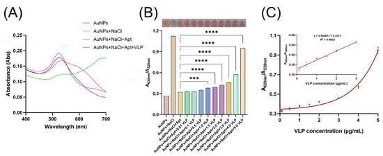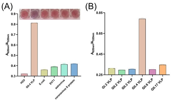 Human norovirus (HuNoV), particularly the GII.4 genotype, is a leading cause of acute gastroenteritis worldwide, posing a significant public health and economic burden due to its low infectious dose. To address the need for rapid and sensitive detection, we developed a colorimetric biosensor utilizing a structure-optimized aptamer and gold nanoparticles (AuNPs). Biotin-modified aptamers could protect AuNPs from aggregation in salt solution. Upon specific binding to GII.4 HuNoV virus-like particles (VLPs), this protective effect is disrupted, leading to AuNP aggregation and a measurable color shift quantified by the A620/A520 absorbance ratio. Under optimized conditions, the assay demonstrated a linear response (y = 0.004597x + 0.3277, R2 = 0.9922) to GII.4 HuNoV VLP concentrations ranging from 0.1 to 3.0 μg/mL, with the recovery rates between 91.74% and 106.43%. The biosensor exhibited high specificity for GII.4 HuNoV, showing minimal cross-reactivity with other common diarrheal pathogens, and achieved an exceptional detection limit of 27.2 copies/mL in a fecal matrix. Molecular docking and point mutation confirmed the critical roles of specific nucleotide bases (T20, C22, G31, and G44) in the aptamer and the Asn55 residue in the viral capsid for binding. This work establishes a sensitive, rapid, and cost-effective aptamer-based colorimetric platform suitable for the large-scale monitoring of GII.4 HuNoV.