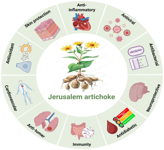 Jerusalem artichoke (JA) (Helianthus tuberosus), a perennial plant of the Asteraceae family, is well known for its high inulin content and diverse bioactive compounds, including flavonoids, phenolic acids, sesquiterpenes, and amino acids. Extracts derived from different parts of JA, such as tubers, leaves, and flowers, have demonstrated a wide range of biological activities, including antioxidant, anti-inflammatory, antihyperglycemic, antihypertensive, and antifungal effects. These properties highlight JA’s potential in the prevention and management of chronic diseases such as diabetes, cardiovascular disorders, obesity, and colorectal cancer. Recent studies also suggest that JA benefits skin health through anti-aging and barrier-protective mechanisms and enhances immune function by modulating the intestinal microbiota. Owing to its multifunctional physiological activities, JA is being explored as a valuable raw material for food, nutraceutical, cosmetic, and pharmaceutical applications. However, most existing research has focused primarily on inulin, while comprehensive studies on other bioactive constituents and their clinical validation remain limited. This paper aims to provide a comprehensive overview of the bioactive compounds present in JA, elucidate their health-promoting functions, discuss their pharmacokinetics, and outline future perspectives on their potential as functional ingredients and biohealth materials.