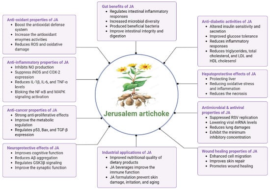 Jerusalem artichoke (JA) (Helianthus tuberosus), a perennial plant of the Asteraceae family, is well known for its high inulin content and diverse bioactive compounds, including flavonoids, phenolic acids, sesquiterpenes, and amino acids. Extracts derived from different parts of JA, such as