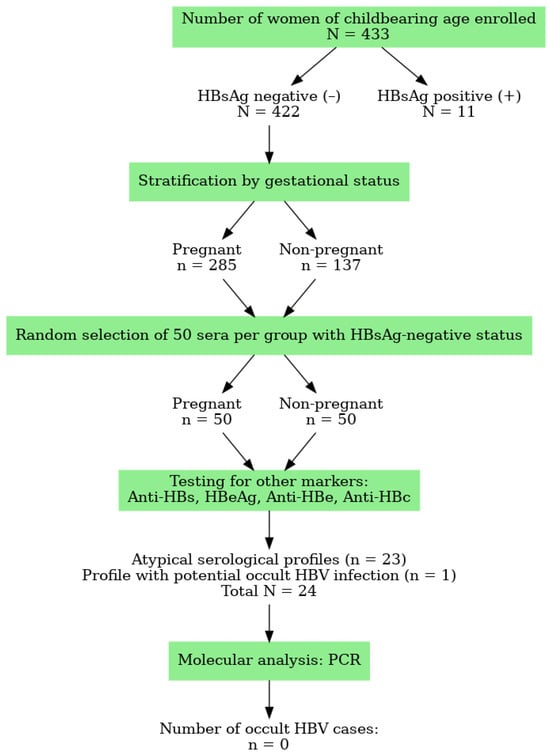Occult hepatitis B infection (OBI) and mutated forms of the hepatitis B virus (HBV) represent diagnostic challenges, especially in individuals with atypical serological profiles. This study explores the molecular characteristics of HBV in HBsAg-negative women of childbearing age exhibiting atypical serological markers. We