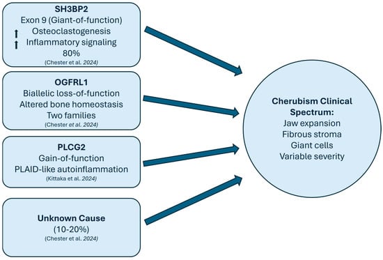 Cherubism is a rare fibro-osseous disorder of the jaws that typically presents in early childhood and is recognised as genetically heterogeneous. While the condition is well described in non-African populations, African data and molecular confirmation remain limited. Background/Objectives: This structured narrative review aimed