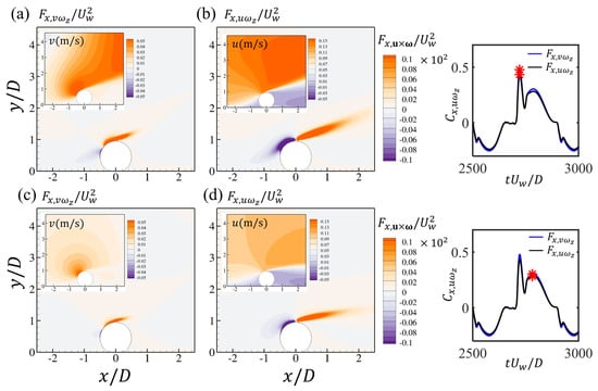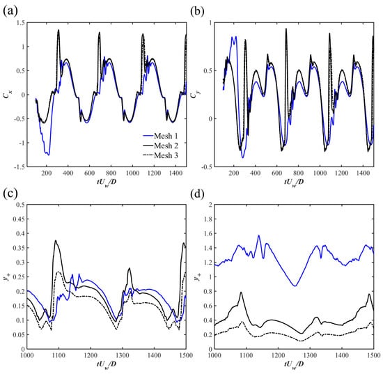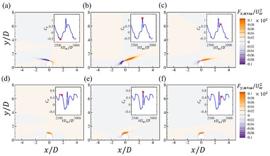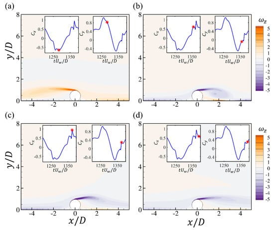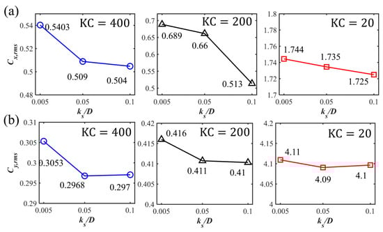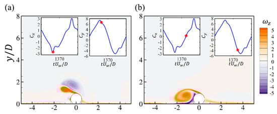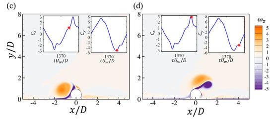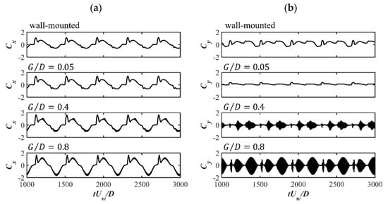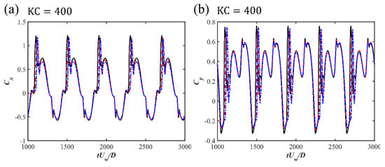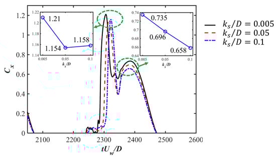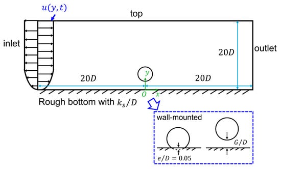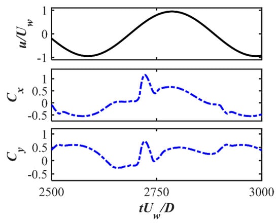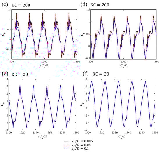 Pipelines and power cables are critical infrastructures in coastal areas for transporting energy resources from offshore renewable installations to onshore grids. It is important to investigate the hydrodynamic forces on pipelines and cables and their surrounding flow fields, which are highly related to their on-bottom stability. The time-varying hydrodynamic forces coefficients and unsteady surrounding flows of a near-seabed pipeline subjected to a wave-induced oscillatory boundary layer flow are studied through numerical simulations. The Keulegan–Carpenter numbers of the oscillatory flow are up to 400, which are defined based on the maximum undisturbed near-bed orbital velocity, the pipeline diameter and the period of the oscillatory flow. The investigated Reynolds number is set to , defined based on and . The influences of different seabed roughness ratios (where is the Nikuradse equivalent sand roughness) up to 0.1 on the hydrodynamic forces and the flow fields are considered. Both a wall-mounted pipeline with no gap ratio to the bottom wall and a pipeline with different gap ratios to the wall are investigated. The correlations between the hydrodynamic forces and the surrounding flow patterns at different time steps during one wave cylinder are analyzed by using the force partitioning method and are discussed in detail. It is found that there are influences of the increasing on the force coefficients at large while for the small , the inertial effect from the oscillatory flow dominates the force coefficients with small influences from different . The FPM analysis shows that the elongated shear layers from the top of the cylinder contribute to the peak values of the drag force coefficients.