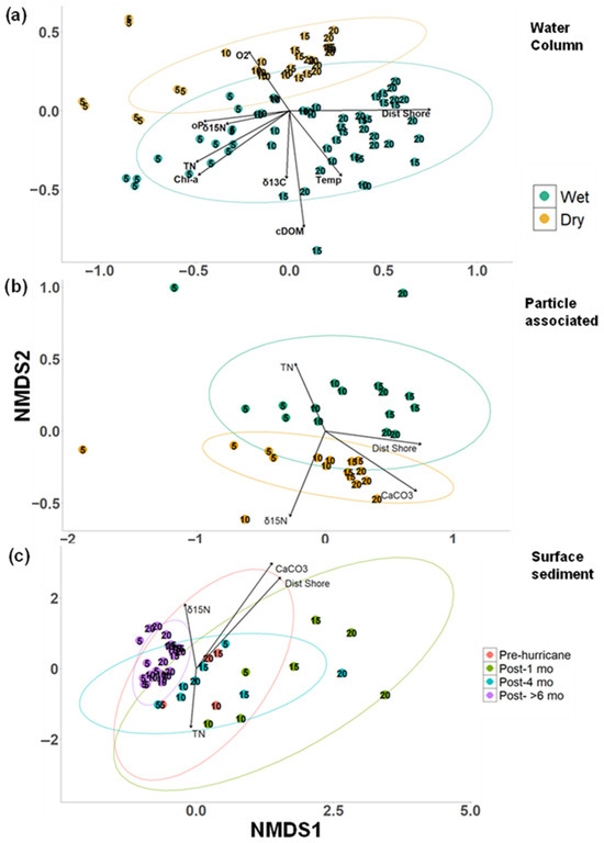 Microbial communities play a crucial role in coastal ecosystem function, yet their seasonal and spatial dynamics in response to environmental change remain underexplored in tropical and subtropical regions. This yearlong study investigated microbial composition in water, sinking particles, and sediments along an inshore–offshore gradient influenced by the Caloosahatchee River Estuary in southwest Florida. The region has been altered by rapid coastal development and was struck by Hurricane Ian in September 2022. Environmental parameters exhibited significant spatiotemporal variation, shaping microbial beta diversity in all habitats. Sediment communities showed the greatest hurricane-induced disruption but returned to pre-disturbance conditions within six months. Dominant microbial classes included Alphaproteobacteria, Bacteroidia, and Gammaproteobacteria. Biogeochemical cycling taxa displayed strong habitat specificity, such as Desulfobulbia which dominated sinking particles, Desulfobacteria which was abundant in sediments, and Nitrosomonadaceae and Nitrosopumilaceae which were key nitrifiers in water and sediments, respectively. Particle–sediment taxonomic overlap suggests resuspension processes. Several inshore microbial indicators were consistently present across microbial habitats, especially at estuarine sites, suggesting the estuary as a microbial diversity reservoir for the coastal zone. These results highlight the value of long-term microbial monitoring to understand ecosystem change and resilience in dynamic coastal environments.