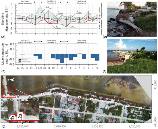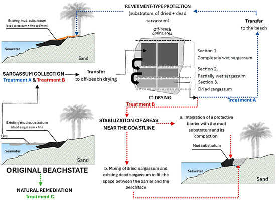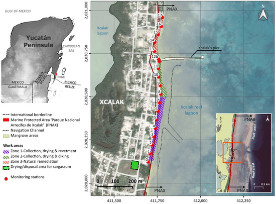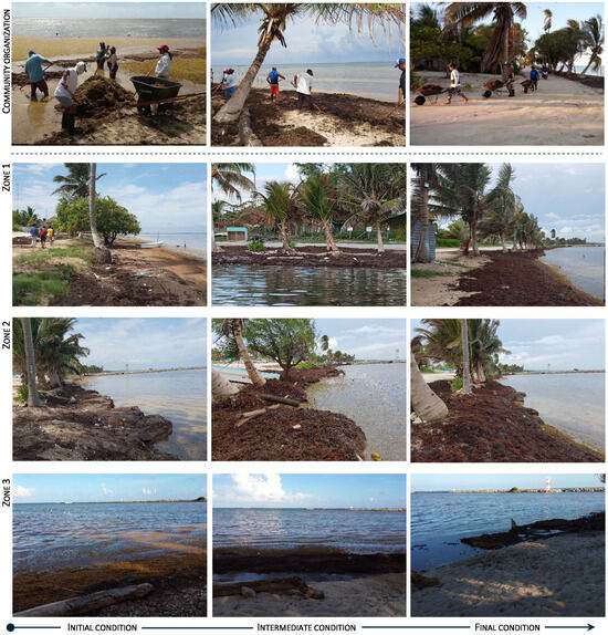 Unprecedented quantities of pelagic sargassum since 2011 have demanded technical and management responses. Inappropriate measures might worsen environmental impacts, particularly in low-income regions and protected natural areas that also require low-cost, socio-ecologically integrated alternatives. This study aims to evaluate the effectiveness and local perception of sargassum clean-up treatments developed through a community–academic collaboration within a socio-ecological systems framework in the marine protected area Xcalak Reefs National Park (PNAX), at the southernmost Mexican Caribbean coast. In 2019 and 2021, clean-up efforts were implemented through the national PROREST program and a self-organized community group of 35–40 members supported by a multidisciplinary research advisory team. Monitoring in 2021 estimated sargassum removal at 4012 m2 over 50–75 work hours. Although average shoreline retreat was obtained (δmean = −0.22 m), final accretion of ~0.96 m alleviated community concerns about erosion linked to clean-up activities. The most effective and socially accepted clean-up treatment involved sargassum spreading, collection, drying, and revetment-type beach protection, reducing odors and harmful fauna. However, treatments aimed at shoreline stabilization were impractical, raising doubts about their long-term efficacy. These findings highlight the relevance of integrating ecological performance and social perception in sargassum management, especially where co-management with local communities in marine protected areas is needed.