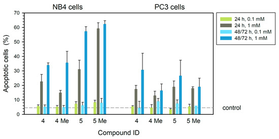 The purpose of this work was to study water-soluble platinum complexes as potential therapeutic agents. We used water-soluble platinum(II) complexes containing sulfonated N-heterocyclic carbene ligands (NHC), applied on two human cell models: human NB4 acute promyelocytic leukemia and PC3 prostatic cancer cells. We studied the toxic effects on these two types of human tumor cells. We analyzed metabolic activity, membrane damage, cell cycle, DNA fragmentation and programmed cell death. In human NB4 leukemia cells, the water-soluble dimethyl NHC complex 5Me proved highly toxic. It extinguished cell metabolism at 1 mM for 24 h. This treatment gave rise to the presence of fragmented DNA (subdiploid DNA). This compound promoted programed cell death in 60% of the cells. At longer times, the treatments produced neither higher fragmentation of DNA nor augmented apoptosis. 5Me complex, at 100 µM, showed slight toxicity on NB4 cells. In PC3 cells, dimethyl complex 5Me (1 mM for 24 h) is less toxic (reduced DNA fragmentation and programmed cell death) than in NB4 cells. Mono-NHC complexes 4 and 5 treatments at a high concentration for 24 h on PC3 cells produced apoptosis (30% of the cells) but their damage on cell permeability and DNA fragmentation was weak. Thus, PC3 cells are more resistant to NHC platinum(II) complexes than NB4 cells.