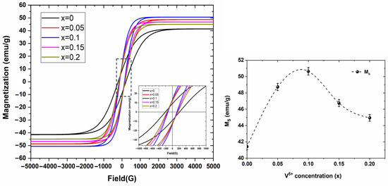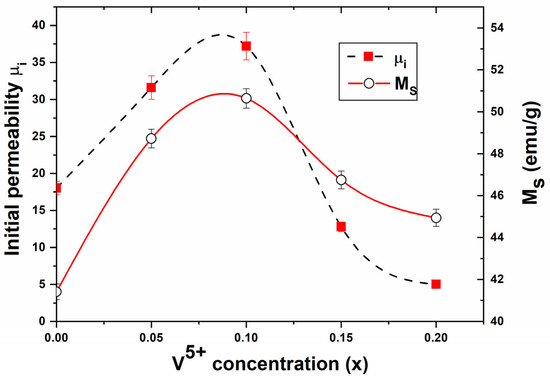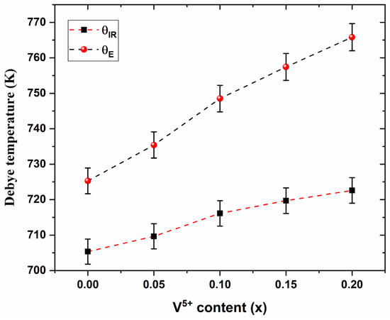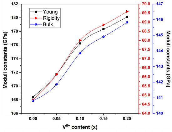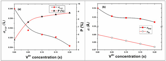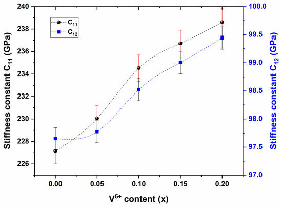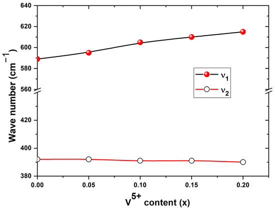 The influence of vanadium substitution on the structure, elastic, mechanical, and magnetic behavior of lithium ferrite (Li0.5+xVxFe2.5−2xO4; x = 0.00–0.2) was systematically studied. X-ray diffraction (XRD) was used to investigate the crystal structure, and infrared spectroscopy (IR) was used to determine the cation distribution between the two ferrite sublattices, in addition to the elastic and mechanical behavior of Li0.5+xVxFe2.5−2xO4 ferrites. X-ray analysis revealed a monotonic decrease in lattice parameter from 8.344 Å to 8.320 Å with increasing V5+ content, confirming lattice contraction and stronger metal–oxygen bonding. Despite a moderate increase in porosity (from 6.9% to 8.9%), the elastic constants C11 and C12 increased, indicating improved stiffness and reduced compressibility. The derived Young’s, bulk, and rigidity moduli rose with the doping of V5+. Correspondingly, the longitudinal, shear, and mean velocities (Vl, Vs, and Vm) increased. The Debye temperature also showed a linear rise from 705 K to 723 K with V5+ doping, directly reflecting enhanced lattice stiffness and phonon frequency. Furthermore, both the saturation magnetization (MS) and the initial permeability (μi) increased up to V5+ concentration x = 0.1 and then decreased. Curie temperature (TC) decreased with increasing V5+ concentration, while both the saturation magnetization (MS) and the initial permeability (μi) increased up to V5+ concentration x = 0.1 and then decreased, while the coercivity (HC) showed the reverse trend. These results confirm that V5+ incorporation significantly enhances the Li ferrite, improving its elastic strength, lattice energy, thermal stability, and magnetically controlling properties and making them suitable for a variety of daily uses such as magneto-elastic sensors, high-frequency devices, and applications requiring mechanically robust ferrite materials.