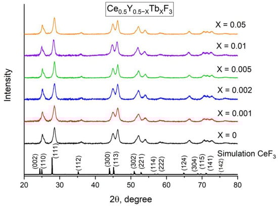 The studied Ce0.5Y0.5−XTbXF3 (X = 0, 0.001, 0.002, 0.005, 0.01, and 0.05) nanoparticles were synthesized via the water-based co-precipitation method. All the samples demonstrated diameters in the 17–20 nm range and a hexagonal phase corresponding to