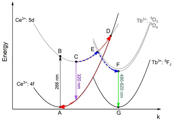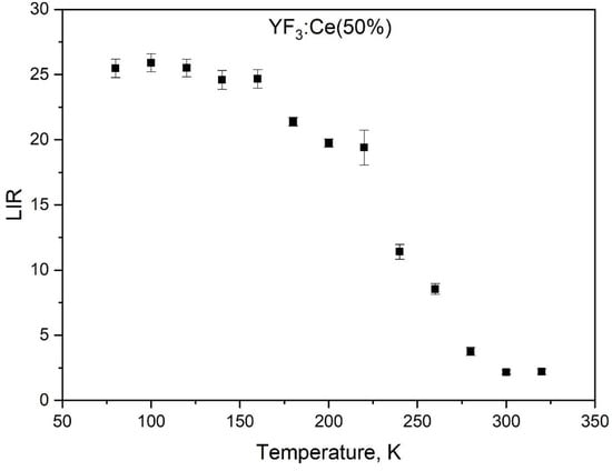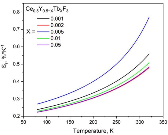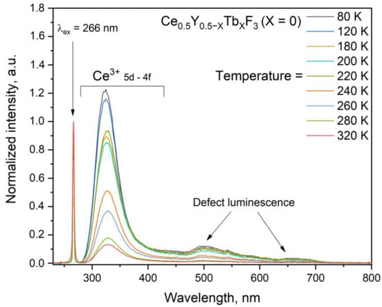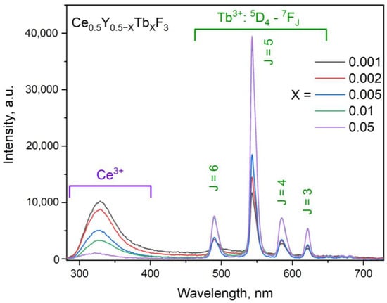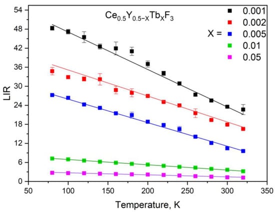 The studied Ce0.5Y0.5−XTbXF3 (X = 0, 0.001, 0.002, 0.005, 0.01, and 0.05) nanoparticles were synthesized via the water-based co-precipitation method. All the samples demonstrated diameters in the 17–20 nm range and a hexagonal phase corresponding to the phase of CeF3. Under 266 nm excitation (4f–5d absorption band of Ce3+), the luminescence spectrum shape was notably dependent on temperature. The integrated luminescence intensity ratio (LIR) of Ce3+ and Tb3+ (5D4–7F3) peaks was chosen as a temperature-dependent parameter. It was shown that the LIR functions linearly decay. The rate of decay decreases with the increase in Tb3+ concentration. This was explained by the fact that in the case of low Tb3+ concentrations, the spectral temperature dependence is mostly based on effective thermal quenching of Ce3+ luminescence. At higher Tb3+ concentrations, there is a higher probability of Ce3+ to Tb3+ energy transfer. Here, the efficiency of the temperature dependence of this process is lower, and the rate of LIR decay is lower as well.