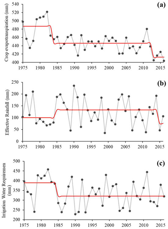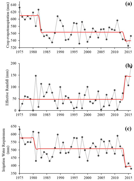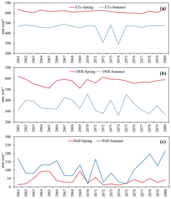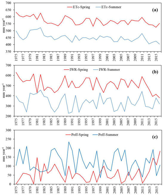 Climate change has put the agricultural industry under enormous pressure, as rising temperatures and changing rainfall patterns are affecting crop yields and productivity. The temporal variability of the irrigation water requirement (IWR) as a function of crop evapotranspiration (ETc) and effective rainfall (Peff)