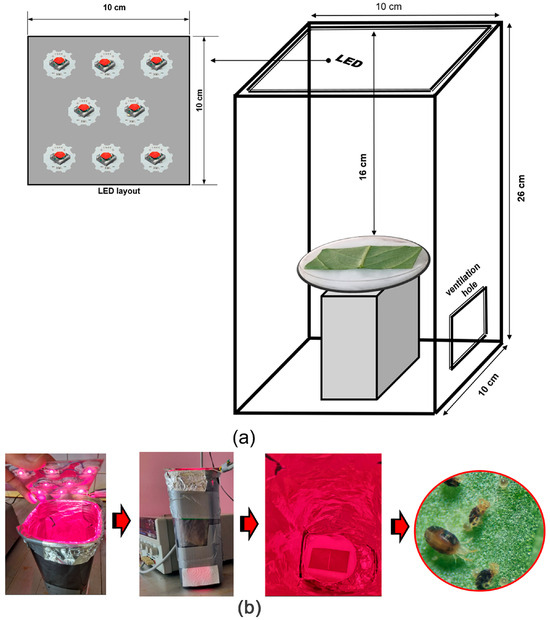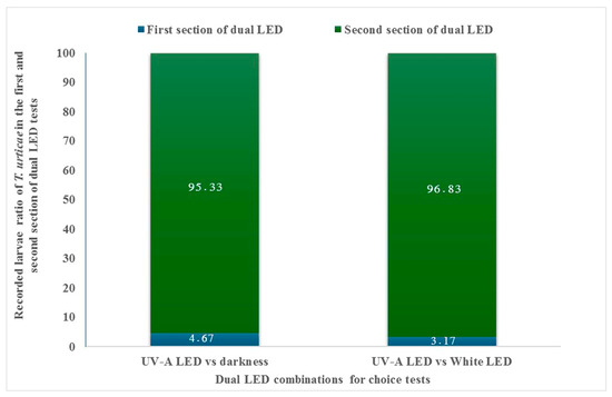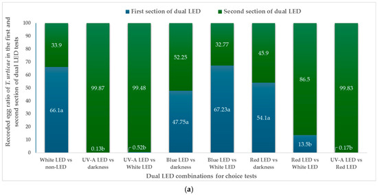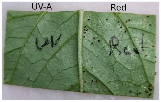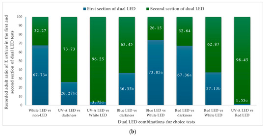 The two-spotted spider mite, Tetranychus urticae Koch, is a major agricultural pest that causes economic losses in the cultivation of most crops worldwide. Pesticide resistance and the phase-out of many active pesticidal substances have accelerated research into alternative methods for pest management. The effects of light-emitting diodes (LEDs) on plants, as well as their potential use in pest management, have attracted the attention of researchers for the last 25 years. In this study, the repellent effects of UV-A, blue, and red LEDs on T. urticae were investigated using choice tests in laboratory conditions. The lethal effect of red LED light on adult individuals was determined by a no-choice test. Importantly, red LED caused 67.0 ± 4.5% (mean ± SE) mortality in adults in the no-choice test. Second, the UV-A LED clearly had a strong repellent effect on T. urticae in the choice tests. In the “UV-A vs. white LED” and “UV-A vs. darkness” choice tests, the egg-laying percentage in the UV-A part remained below 0.55%. Furthermore, UV-A also had a significant repellent effect on T. urticae larvae. In the choice tests, the larval ratio in the UV-A part was less than 5%. The results of laboratory experiments indicated that red and UV-A LEDs have significant lethal and repellent effects on T. urticae. Comprehensive investigations should be performed in greenhouses using different strategies to optimize how these potential effects can be used in pest management.