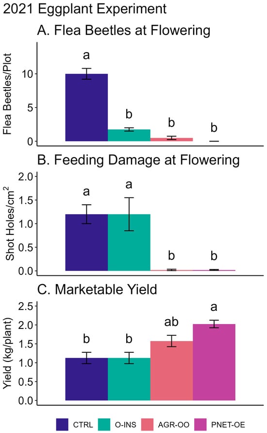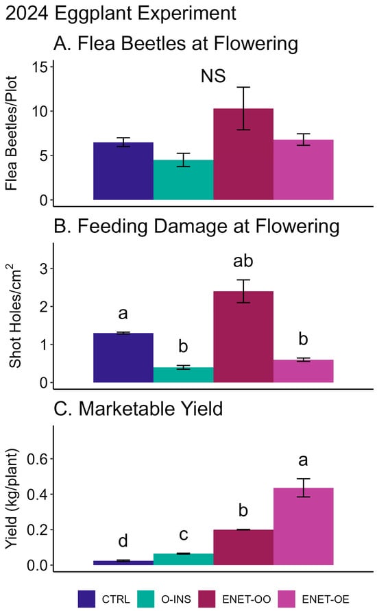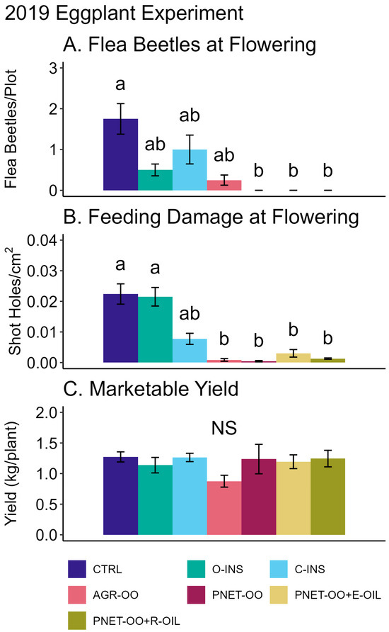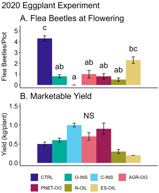 Organic eggplant production in the United States is challenged by flea beetles, which stunt eggplant growth and reduce yield. Across four experiments between 2019 and 2024, we compared the effects of various pest management strategies on flea beetle abundance, damage, and marketable yield