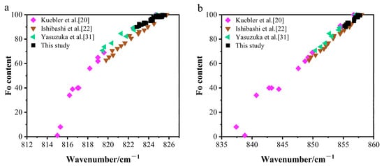 −1 shifts systematically to higher wavenumbers with increasing Fo content. Although previous studies have established general relationships between Fo content and Raman shifts in olivine, research focusing specifically on high-Fo (90–100) compositions remains limited, primarily due to a scarcity of suitable samples. This study addresses this gap by systematically investigating 45 high-Fo (90–100 olivine samples, to establish regression relationships between the Fo content and both the primary doublet (P1: 822–826 cm