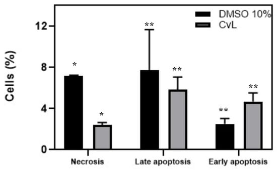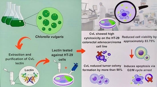 Background/Objectives: Colon cancer is the third most common type of cancer in the world, characterized by a high risk of metastasis, resistance to various drugs, and late diagnosis. In addition, the drugs used for treatment are associated with serious neurological damage, causing acute and chronic pain and compromising the patient’s quality of life. Meanwhile, lectins are proteins capable of exerting cytotoxic action on cells from various tumors in a selective manner, without exerting significant toxicity on healthy cells. Despite this, studies on the potential of lectins obtained from microalgae are still scarce in the literature. In this sense, the objective of this study was to evaluate the antitumor activity of lectin isolated from the microalgae Chlorella vulgaris (CvL) on colorectal cancer cells, HT-29. Methods: The purified lectin was tested for cytotoxicity using MTT colorimetric methods, in addition to clonogenicity, cell cycle, apoptosis, and necrosis tests, analyzed by flow cytometry. Results: The assays demonstrated that the lectin was able to induce cell death in the HT-29 tumor line by approximately 83.75% with an IC50 value of 21.5 µg/mL−1, reduced colony formation by more than 90%, was able to regulate the cell cycle by apoptosis, and did not present significant necrosis. These results show that microalgae lectins have the potential to be exploited in the control of neoplastic cells.