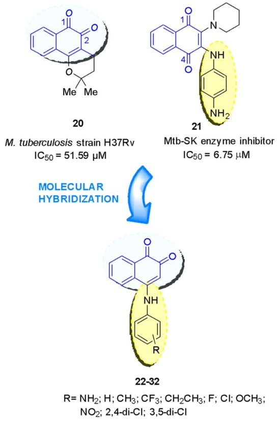 Background: Tuberculosis (TB) remains a critical global health concern, exacerbated by the emergence of multidrug-resistant and extensively drug-resistant strains of Mycobacterium tuberculosis. In the search for novel therapeutic agents, naphthoquinones have garnered interest due to their diverse mechanisms of action and potent antimycobacterial activity. In this study, we report the design, synthesis, and biological evaluation of a novel series of eleven naphthoquinone-based derivatives (compounds 22–32), developed through a molecular hybridization strategy targeting shikimate kinase (Mtb-SK) an essential enzyme present exclusively in M. tuberculosis. Methods: The compounds were synthesized via a straightforward and efficient synthetic route, and preliminary screening identified five molecules with significant anti-TB activity. Notably, compound 26, 4-(4-ethoxyphenyl) amino) Naphthalene-1,2-dione, exhibited a minimum inhibitory concentration (MIC) of 21.33 µM, comparable to ethambutol and substantially more potent than pyrazinamide. Results: Molecular docking studies indicated that all active compounds interact favorably within the shikimate binding pocket of Mtb-SK, following the proposed mechanism of action. Additionally, ongoing cytotoxicity assays in HepG2 cells aim to assess the selectivity of these derivatives. Conclusions: These findings support the potential of this new class of naphthoquinones as promising scaffolds for the development of anti-TB agents, contributing to the growing body of research focused on new chemotherapeutic options against tuberculosis.