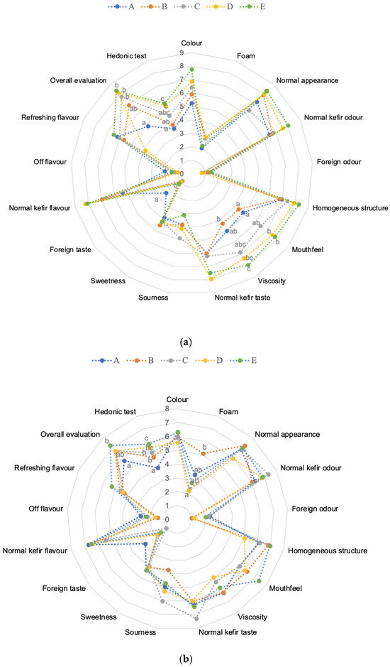Kefir grains, originating from the Caucasus, are irregularly shaped, semi-solid granules resembling popcorn or cauliflower (0.3 to 3.5 cm), composed of bacteria and fungi embedded in extracellular polysaccharides such as kefiran. In this study, kefir samples were produced using different ratios of goat’s and cow’s milk (100:0, 75:25, 50:50, 25:75, and 0:100) to examine microbial populations, physicochemical and volatile properties, rheological behaviour, antioxidant capacity, and organic acid content. The type of milk used significantly affected the chemical composition and pH (p < 0.05), although titratable acidity remained stable during storage. Increasing the proportion of goat’s milk decreased viscosity but enhanced the total free amino acid (FAA) content. Goat milk kefir exhibited stronger antioxidant activity than cow milk kefir due to the formation of bioactive peptides and FAAs through proteolysis, with the highest values observed in samples with a higher proportion of goat’s milk and the lowest in 100% cow’s milk kefir. Organic acid levels increased during fermentation and, in 100% goat milk kefir, lactic, acetic, propionic, hippuric, butanoic, and citric acids reached their highest concentrations. The diversity and intensity of volatile compounds also increased proportionally with the goat milk ratio. In conclusion, considering antioxidant activity, volatile aroma components, organic acid content, sensory properties, and viscosity values, sample D, which is 75% goat milk kefir, is recommended for consumers.