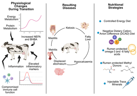 The transition period, spanning approximately three weeks before and after parturition, represents one of the most critical physiological windows in dairy production. Profound metabolic, endocrine, and immune adaptations occur as the cow shifts from gestation to lactation, predisposing high-yielding cows to oxidative stress, inflammation, and metabolic imbalance. Negative energy and metabolisable protein balances stimulate extensive lipolysis and the accumulation of non-esterified fatty acids (NEFAs) and β-hydroxybutyrate (BHBA), which can impair hepatic function and postpartum performance. This review integrates recent advances in the understanding of metabolic and immunometabolic regulation during transition, emphasising the interplay among energy metabolism, oxidative stress, and immune dysregulation. It critically re-evaluates current nutritional interventions including controlled-energy and negative DCAD diets, rumen-protected polyunsaturated fatty acids, and methyl donor amino acids while highlighting the emerging potential of injectable trace minerals as adjunct strategies to improve metabolic resilience. The review concludes by outlining remaining knowledge gaps and proposing a framework linking physiological mechanisms with targeted nutritional management.