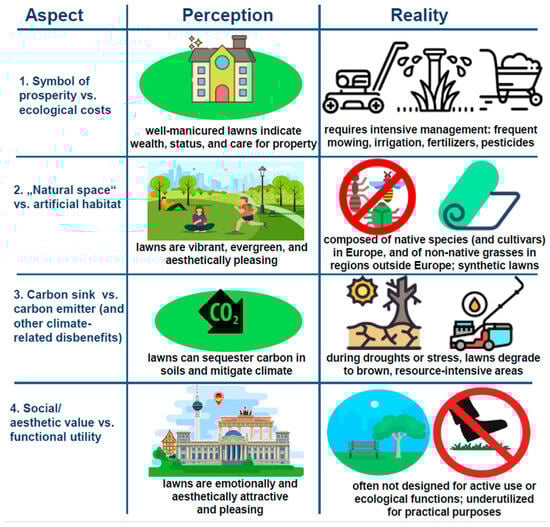 Ongoing urbanization, biodiversity decline, and intensifying climate change increasingly challenge the sustainability of urban green spaces (UGS) dominated by conventional, intensively maintained lawns. Although widespread across cities worldwide, lawns are criticised for their low biodiversity value and high resource demands. This paper explores