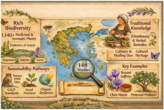 Greece lies within the Mediterranean global biodiversity hotspot and harbors exceptional plant richness and endemism, including numerous medicinal and aromatic plants (MAPs). These taxa underpin long ethnobotanical traditions and contemporary bioeconomy niches (culinary herbs, essential oils, phototherapeutics). The aim of this review is