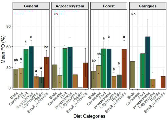 The red fox (Vulpes vulpes) is a widely distributed and highly adaptive small carnivore known by its generalist diet, which includes small mammals, invertebrates, and fruits. Despite its ecological relevance, how habitat heterogeneity affects its diet across the Mediterranean, a biodiversity hotspot shaped by long-term human disturbance, remains insufficiently synthesized. In this review, we synthesized and analyzed published studies that reported habitat-specific data on the red fox diet in the Mediterranean. Only 12 studies met the selection criteria, and no study directly compared two different habitats. The studied areas covered three dominant habitats: forests, scrublands (garrigue), and agroecosystems, and diet items were grouped in 7 categories: birds, carcasses, fruits, invertebrates, lagomorphs, small mammals, and reptiles. Overall diet composition varied significantly, with invertebrates and fruits being the most frequent diet items. In turn, lagomorphs and reptiles were the least frequent. In turn, diet composition varied little across habitats, indicating that diet variation follows specific local resource abundance regardless of habitat type. Despite the analytical limitations associated with the limited availability of habitat-explicit studies. The results highlight the pronounced dietary plasticity of the red fox and its capacity to integrate resource availability across heterogeneous Mediterranean landscape mosaics. This trophic adaptability and top predator role support various ecosystem functions such as controlling invertebrate and small mammal populations, dispersing seeds, and cycling nutrients, reinforcing the potential of the red fox as functional bioindicator in the Mediterranean. Therefore, sustainable land management, especially in agricultural areas, and restoration efforts for degraded areas should consider the beneficial roles of generalist carnivores like the red fox.