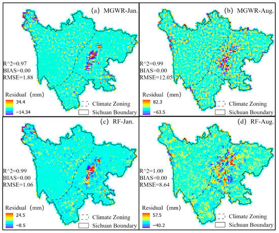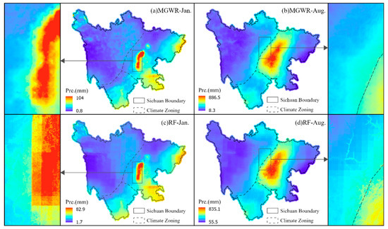 Fine spatial information of precipitation plays a significant role in regional eco-hydrological studies but remain challenging to derive from satellite observations, especially in complex terrain areas. Sichuan Province, located in the southwest of China, has a highly variable terrain, and the spatial distribution of precipitation exhibits extreme heterogeneity and strong autocorrelation. Multi-scale Geographically Weighted Regression (MGWR) and Random Forest (RF) were employed for downscaling the Global Precipitation Measurement Mission (GPM) products based on high spatial resolution terrain, vegetation, and meteorological data in Sichuan province, and their specific effects on gauged precipitation accuracy and spatial precipitation distributions have been analyzed based on the influences of environmental variables. Results show that the influence of each environmental factor on the distribution of precipitation at different scales was well represented in the MGWR model. The downscaled data showed good spatial sharpening effects; additionally, the biases in the overestimated region were well corrected after downscaling. However, when based on spatial autocorrelation and considering adjacent influences, the MGWR performed poorly in correcting outlier sites adjacent to the high–high clusters. Compared with MGWR, relying on independently constructed decision trees and powerful regression capabilities, superior correction for outlier sites has been achieved in RF. Nevertheless, the influence of environmental variables reflected in RF differs from actual conditions, and detailed characteristics of precipitation spatial distribution have been lost in the downscaled results. MGWR and RF demonstrate varying applicability when downscaling GPM products in complex terrain areas, as they both improve the ability to finely depict spatial information but differ in terms of texture property expression and precipitation bias correction.