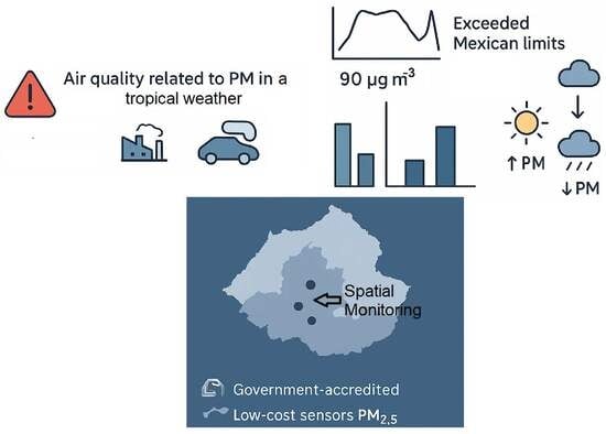 Tropical weather cities, such as Mérida in Yucatán, Mexico, are perceived as air pollution-free environments. This study aimed to evaluate the air quality in Mérida City over five years, focusing on PM2.5 and PM10 as well as spatial and temporal factors. A government-accredited monitoring station for PM2.5 (2018–2022) and economic air sensors for PM2.5 and PM10 (2023) were used. Results showed the maximum daily (90 μg m−3) and annual PM2.5 (23 μg m−3) averages for 2020 exceeded the Mexican regulations. Sensors indicated that the fixed pollution sources influenced PM2.5 and PM10. Spatially and temporally, the southwest of the city in the dry season of 2023 showed the highest PM2.5 and PM10. Tropical conditions (solar radiation and temperature) increased PM, while high humidity and precipitation decreased it. Air quality improved during the rainy season. The southwest zone had the highest density of diesel vehicles and fixed pollution sources, which contributed to the highest PM concentration. The monitoring showed that air quality related to PM in Mérida City is a concern. Local and external factors are affecting the air quality. It is mandatory to regulate air emissions from fixed sources and implement vehicle verification, even in tropical weather cities.