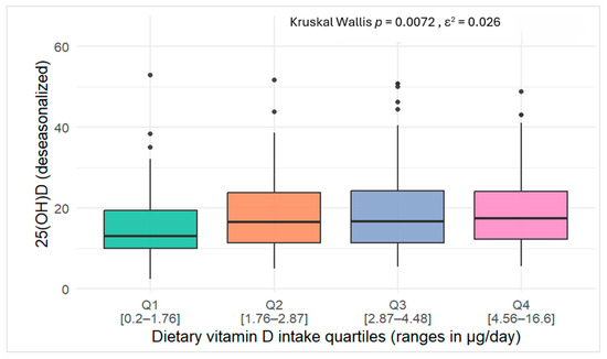 Background: Vitamin D is essential for women’s health, yet deficiency is widespread among Moroccan premenopausal women. Objectives: This study examined vitamin D intake, dietary sources, determinants, and predictors of serum 25-hydroxyvitamin D [25(OH)D3] in 355 women aged 18–49 years in Meknes, Morocco. Methods: Intake and sun exposure were assessed with validated questionnaires, and serum 25(OH)D3 was measured by chemiluminescence immunoassay. Multivariable and penalized regression (LASSO) were applied to deseasonalized values. Results: Median intake was 2.89 µg/day, and fewer than 20% of participants met the 5 µg/day recommendation. Fish (48%), dairy (24.39%), and meat (9.40%) were the main sources. Intake varied by age and residence: women aged 18–25 had significantly lower intakes (p = 0.027), while rural women consumed less than urban women (2.73 vs. 3.18 µg/day, p = 0.014), with inadequacy in 67.70% vs. 32.30% (p = 0.018). In adjusted regression, quartiles Q2–Q4 (1.76–16.60 µg/day) were associated with ~+3 ng/mL higher serum 25(OH)D compared to Q1 (0.20–1.76 µg/day, p < 0.05). Increments plateaued beyond Q2, and deficiency (<20 ng/mL) persisted in all quartiles (>59%, including 64% in Q4), reflecting limited sun exposure and high adiposity. Sun exposure was a strong positive predictor (β = 0.35, p < 0.001), while BMI was inversely associated (β = −0.37, p < 0.001). In LASSO, only sun exposure remained, explaining ~3% of variance. Conclusion: In this population, improving sun exposure (≥20 min/day) should be prioritized, alongside increasing vitamin D intake through richer food sources and fortification, while also addressing obesity, with a focus on women at risk of deficiency.