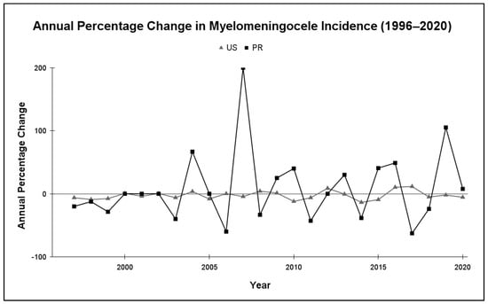 Objectives: Neural tube defects such as myelomeningocele (MMC) remain a significant public health concern despite prevention efforts. Public health measures have reduced the global MMC incidence, but socioeconomic disparities may limit their impact. Puerto Rico (PR) is a United States (US) territory; however, its socioeconomic landscape is vastly different, which may contribute to differences in MMC incidence. In this study, we aimed to compare the differences in MMC incidence and annual variability between PR and the US. Materials and Methods: Data on MMC incidence for the US was obtained from the Centers for Disease Control’s National Vital Statistics Reports, and data for PR from the Puerto Rico Birth Defects Surveillance and Prevention System. Annual percentage change (APC) was used to evaluate year-to-year variation, and multiple linear regression analysis was applied to compare incidence rates. Results: The mean annual MMC incidence in 1996–2020 was 4.88 per 10,000 live births in PR (SD = 1.86), and 1.78 (SD = 0.35) in the US, with an estimated mean difference of 3.11 (p < 0.001). APCs during this period varied significantly, ranging from +200% to −63%. A subgroup analysis after folic acid fortification efforts in PR (1999–2020) showed a persistently elevated incidence in PR (mean = 4.41, SD = 1.33) vs. US (mean = 1.67, SD = 0.25), with an estimated mean difference of 2.72 (p < 0.001). Conclusions: Despite folic acid fortification and public health interventions, MMC incidence in PR remains higher and more variable. These findings underscore the need for improved disease reporting and targeted, region-specific preventive strategies.