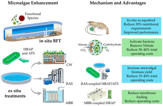 The intensification of shrimp aquaculture is crucial for global food security, but poses significant environmental challenges. This review critically assesses the strengths and bottlenecks of two main treatment paradigms: in situ systems, chiefly biofloc technology (BFT), and advanced ex situ systems, such as recirculating aquaculture systems (RASs), constructed wetlands (CWs), and membrane bioreactors (MBRs). Although BFT enables nutrient recycling, it suffers from nitrate accumulation and a high energy demand. Likewise, ex situ technologies can achieve a high treatment efficiency, but contend with high costs, large footprints, or membrane fouling. In this review, we propose the strategic integration of microalgae, representing a universal and synergistic solution for overcoming these disparate bottlenecks. We dissect how a microalgal co-culture can simultaneously remove nitrate and reduce the aeration costs in BFT systems. Furthermore, we explore how microalgae-based units can serve as efficient polishing steps for RASs, enhance the performance of CWs, and mitigate fouling in MBRs. This review delves into the fundamental mechanisms of the microalgal–bacterial symbiosis that underpins these enhancements. Finally, we highlight the valorization of the resulting algal biomass as a high-value aquafeed ingredient, which can transform waste management into a value-creation opportunity. This review aims to provide a comprehensive roadmap for developing next-generation, microalgae-enhanced aquaculture systems.