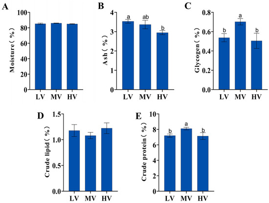 This study examined the effects of hydrodynamic conditions on the growth performance and nutritional quality of Pacific oysters (Crassostrea gigas) in raceway flumes. Oysters were reared under three flow velocities—low (LV, 5 cm/s), medium (MV, 10 cm/s), and high (HV, 20