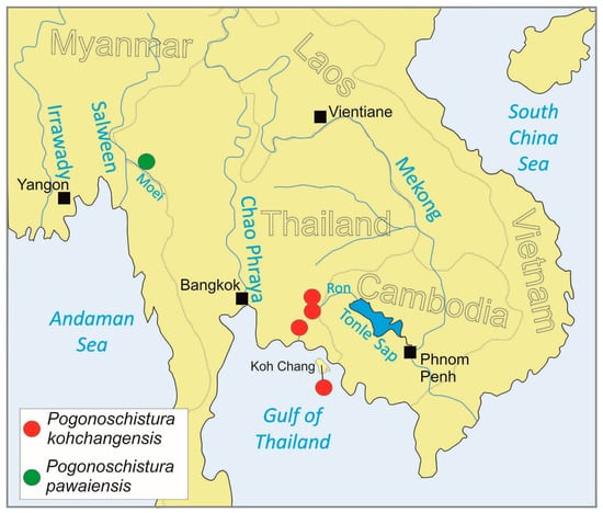 A recent phylogenetic reconstruction based on molecular genetic data revealed the presence of six well-supported clades within the freshwater fish family Nemacheilidae (Burmese, Eastern, Indochinese, Northern, Southern and Sundaic Clade). Species with the present generic name Schistura were found in three of the six major clades. Since the type species of Schistura belongs to the Southern Clade, species in other major clades can no longer be considered as members of the genus Schistura. We here review the generic status of ‘Schistura’ species in the Burmese Clade. ‘Schistura’ savona represents an isolated lineage, for which the genus Acoura is available, previously a synonym of Schistura. A second group comprises two species, ‘Schistura’ kohchangensis and the undescribed ‘Schistura’ cf. kohchangensis. We propose Pogonoschistura as a new generic name for these two species and name the undescribed species. Pogonoschistura differs from all other genera within the Burmese Clade by the combination of the following character states: caudal fin slightly emarginate to emarginate; adult males with a suborbital flap and a suborbital groove; dorsal fin with 7½ or 8½ branched rays; lips not covered by papillae; anus closer to anal-fin base than to pelvic-fin base; and lateral line incomplete, but exceeding vertical through pelvic-fin origin. Pogonoschistura pawaiensis, new species, is distinguished from its congener by having 9+8 branched rays in caudal fin, 7½ branched rays in dorsal fin and a distinct head pigmentation pattern.