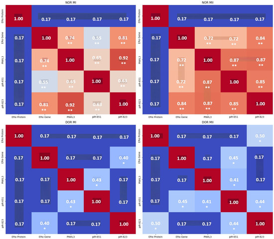 Background: Diminished ovarian reserve is characterized by a decrease in oocyte count and estrogen levels, which leads to infertility. The genetic and epigenetic mechanisms in MI to MII transition or complete MII phase in the oocyte maturation process estrogen receptor alpha and piRNA relationship were evaluated. Methods: This study analyzed 100 cumulus oophorous complex samples from normoresponder and DOR patients undergoing IVF, subdivided into metaphase I and metaphase II stages. To elucidate the ER-α, PIWIL3, piR-651, and piR-823 genes qRT-PCR was used and qualitative ER-α protein expressions were determined by immunohistochemistry. Pearson’s correlation analysis was utilized to evaluate the interactions between genes within each experimental group. Results: The DOR samples exhibited significant downregulation of ER-α gene and protein expression compared to the NOR controls. PIWIL3 gene, piR-651, and piR-823 expressions reduced in DOR MI and MII. Strong positive correlations among ER-α, PIWIL3, piR-651, and piR-823 were observed in NOR, whereas DOR showed weaker correlations and immunohistochemistry verified lower ER-α protein levels in DOR. Conclusions: The disruption of ER-α and piRNA-related gene networks in DOR may underlie the suboptimal maturation of oocytes, and monitoring ER-α, PIWIL3, piR-651, and piR-823 expressions could facilitate early determination of maturation stages and improve assessment of ovarian reserve. The potential for transposition to MII in NOR and DOR oocytes was observed in relation to the association between ER-α protein/gene expression and PIWIL3, which regulates ER-α. Moreover, piR-651 and piR-823, whose expressions depend on estrogen level, indirectly regulate oocyte maturation from MI to MII in both NOR and DOR epigenetically. We suggest that the MI and MII stages of oocytes could be determined earlier in NOR and DOR cases by controlling ER-α, PIWIL3, piR-651 and piR-823 expressions. These molecular markers indicate promise for diagnostic applications in reproductive medicine, warranting further validation in larger cohorts.