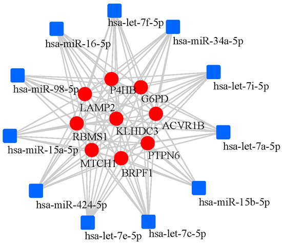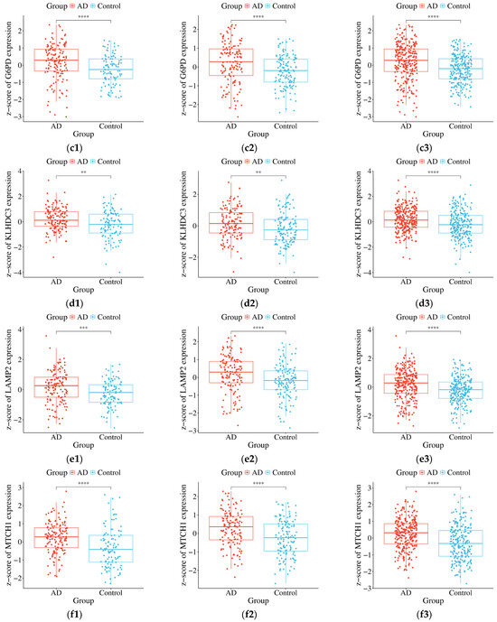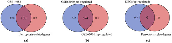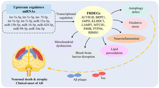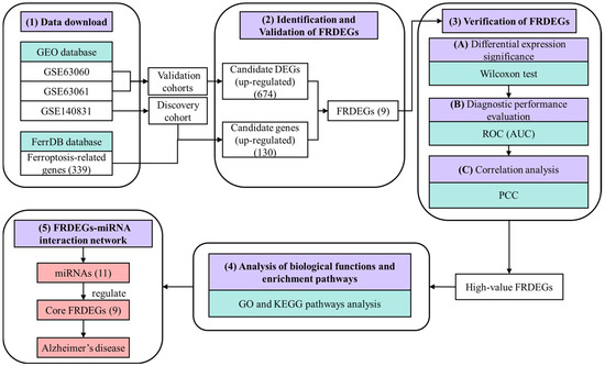 Background: The exact pathogenesis of Alzheimer’s disease (AD), a neurodegenerative disorder, remains unclear. Ferroptosis is a form of cell death characterized by intracellular iron accumulation, and has emerged as a potential contributor to the pathological cascade of AD. Therefore, this study aims to identify core genes that may function as reliable biomarkers for AD through an in-depth analysis of the genetic relationship between ferroptosis-related genes and AD. Methods: This study first obtained the gene expression profiles (GSE140831, GSE63060 and GSE63061 expression profiles). The GSE140831 dataset served as the discovery cohort, and the GSE63060 and GSE63061 datasets were used as independent validation cohorts. R language 4.4.1 was used for standardizing and identifying differentially expressed genes (DEGs) in AD patients in all datasets. Secondly, the ferroptosis-related genes were obtained. By integrating the ferroptosis-related genes, ferroptosis-related DEGs (FRDEGs) were detected. Then, the FRDEGs were verified and evaluated, and the biological functions of the core genes were analyzed. Finally, miRNAs interacting with these core FRDEGs were explored. Results: The study identified nine FRDEGs (ACVR1B, BRPF1, G6PD, KLHDC3, LAMP2, MTCH1, P4HB, PTPN6, RBMS1), which are potentially related and may serve as biomarkers for AD. All nine genes demonstrated statistically significant differential expression (up-regulation) in both independent validation cohorts and in the combined analysis (p < 0.05). Although the area under the curve (AUC) values of these nine genes ranged from 0.61 to 0.71, indicating moderate discriminatory power, these findings suggest that they may be involved in pathways related to AD and are worthy of further investigation as potential auxiliary biomarkers. Finally, a network of hub FRDEGs-miRNAs interaction was constructed. There were 11 miRNAs that may regulate these hub FRDEGs simultaneously. Conclusions: This study showed the significant association of the identified FRDEGs with AD. Also, a core ferroptosis-related biomarker network for miRNAs regulation of AD was constructed. The specific regulatory mechanism is worthy of further investigation.