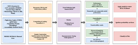 Wildfires represent a growing environmental and socio-economic threat across Mediterranean landscapes, where prolonged summer droughts and human activity increasingly shape ignition susceptibility. This study presents an open and reproducible modelling framework for comparing the relative influence of anthropogenic and biophysical drivers of wildfire