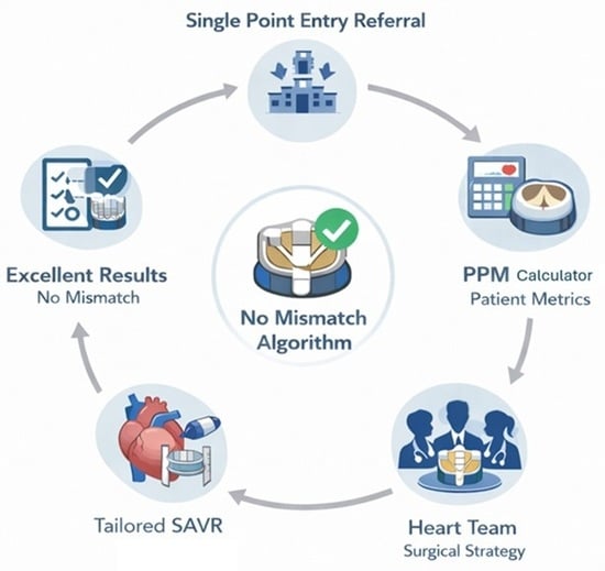 Background: Prosthesis patient mismatch (PPM) is associated with poor outcomes in literature. Prevention of mismatch is crucial in aortic valve replacement, yet there is no current consensus on preventative strategies. Objectives: This study introduces a novel clinical framework, nomenclature, and algorithm for contemporary Heart Team practice, providing a systematic approach for a tailored surgical strategy to anticipate and prevent mismatch. Methods: This was a single-center observational study performing a descriptive analysis of an evolving practice on 100 consecutive patients operated for aortic valve stenosis between 2020 and 2024. A step-by-step No-Mismatch algorithm was designed for the Heart Team to triage, discuss, and decide the surgical strategy prior to the procedure, identifying patients at risk of mismatch, and guiding the surgeon’s plan to prevent PPM and consider a Lifetime Valve Strategy. Results: The algorithm identified 26% of patients at risk of mismatch requiring a No-Mismatch strategy, and 20% at risk of small valve implantation requiring a Lifetime Valve Strategy. This cohort included 51 urgent cases. Valve pathology included 35% congenital, 59% degenerative, 1% rheumatic, and 5% redo operations. Valve implant type: 82% biological, including 29% rapid deployment valve (RDV), and 18% mechanical; 20% of patients required aortic root enlargements (AREs). Pre-, intra-, and post-operative data are presented. Mortality occurred at 1%. All degrees of mismatch were prevented. Conclusions: The surgeon was able to predict mismatch and elected either ARE, RDV, or a mechanical valve as required. Patient selection and a No-Mismatch Heart Team approach are essential to provide a tailored strategy for aortic valve interventions.