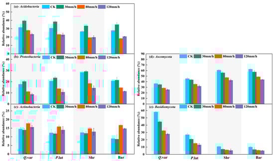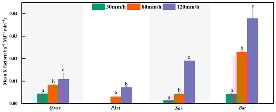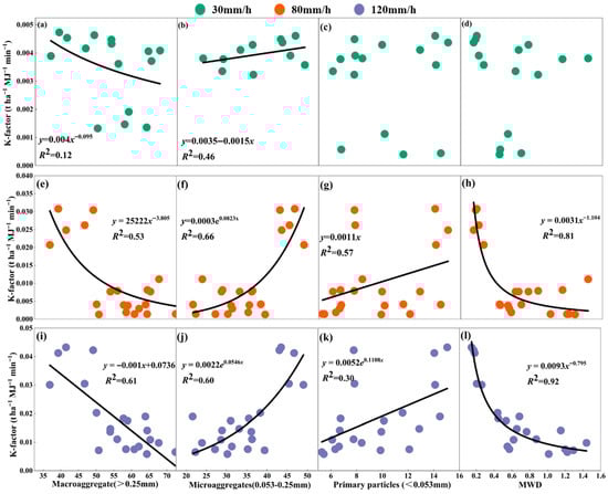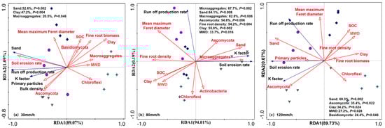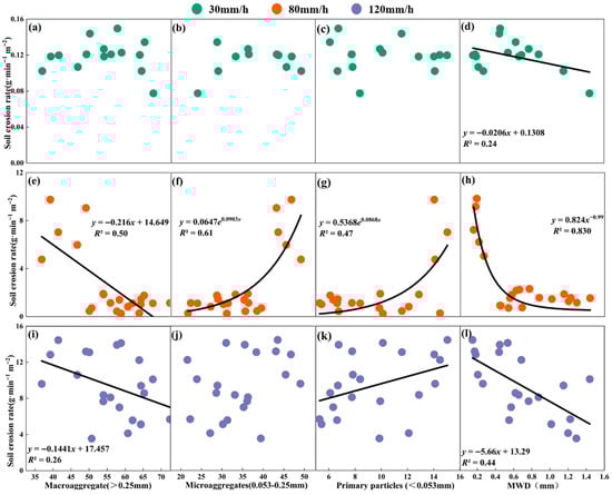 Soil aggregate stability plays a central role in mediating slope erosion, a key ecological process in North China. This study aimed to investigate how aggregate structures (reflected by rainfall intensity and vegetation-type differences) influence the erosion process. Using wasteland as the control, we conducted artificial simulated rainfall experiments on soils covered by Quercus variabilis, Platycladus orientalis, and shrubs, with three rainfall intensity gradients. Key findings showed that Platycladus orientalis exhibited the strongest infiltration capacity and longest runoff initiation delay due to its high proportion of stable macroaggregates (>0.25 mm), while barren land readily formed surface crusts, leading to the fastest runoff. Increased rainfall intensity significantly exacerbated runoff and erosion. When the macroaggregate content exceeded 60%, sediment yield rates dropped sharply, with a significant negative exponential relationship between the mean weight diameter (MWD) and sediment yield; barren land (dominated by microaggregates) faced the highest erosion risk and fell into an erosion–fragmentation vicious cycle. Redundancy analysis revealed that microbial communities (e.g., Ascomycota) and fine roots were dominant erosion-controlling factors under heavy rainfall. Ultimately, the synergistic system of the macroaggregate architecture and root-microbial cementation enabled Platycladus orientalis and other tree stands to reduce soil erodibility via maintaining aggregate stability, whereas shrubs and barren land amplified rainfall intensity effects. barren landbarren landmm·h−1 mm·h−1 mm·h−1 barren land.